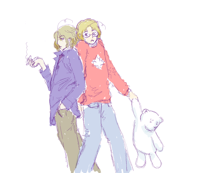 Yaaaay Quebec. <3 I randomly just had to draw him and Canada: Quick sketch is quick. (Still lazy.) I totally imagine him as a more bad-mouthed and grumpy version of France, btw. xD Dunno if it's true but I keep getting the image that they swear a lot. They have a whole selection of swear words of their own after all...