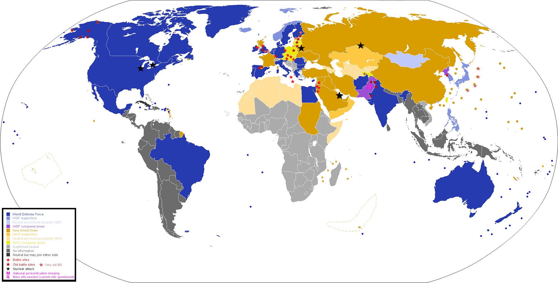 The older Nation smiled at him, before pulling the map closer to herself. "Afghanistan and I have pushed back the invading armies out of Pakistan, but we have not found Pakistan herself." Afghanistan let out a tiny noise like a sob, and hugged her gun tighter. "Worrying though this is, the land itself seems to be fine, but the government buildings are deserted. All the people are looking after themselves, it's anarchy. I'm controlling and taking care of the region in the absence of government, until a vote can be taken and another one formed." This met nods of approval around the room. "After I launched the nuclear attack at Saudi Arabia, there was an initial surge in violence, but now they've lost almost all morale. Even the POWs aren't putting up a fight. In summary, we're doing much better, but we're not out of the woods until Iraq, Iran and the rest pull out."